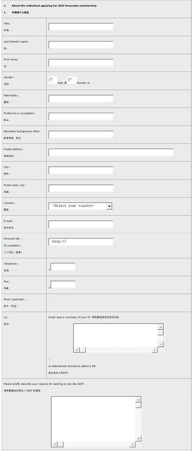 我们鼓励用户使用网上申请,若您有任何困难而无法通过互联网提交,可联系会员秘书Carol Engelspach女士,她将通过电子邮件或传真将Word格式的申请表发送给您。