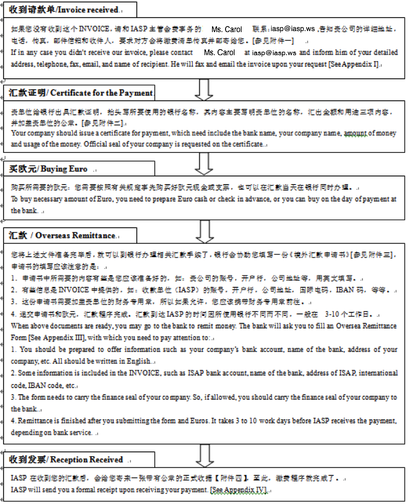以上是我们在北京中国银行向(IASP)缴纳会费的基本程序。由于各地情况有所不同,以上程序仅供参考,各位可以向贵单位的开户银行具体咨询缴费程序。