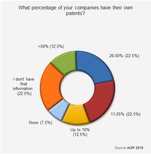 从右侧图表中可以看出,调查结果分布得相当平均、没有明显的绝大多数。不过,50%的反馈指出他们园区内拥有专利的入驻企业占11-50%(而且占11-25%的和占26-50%的也几乎一样多),与这两部分占相似比重(22.5%)的受访园区则表示他们并没有收集入驻企业的这类信息。